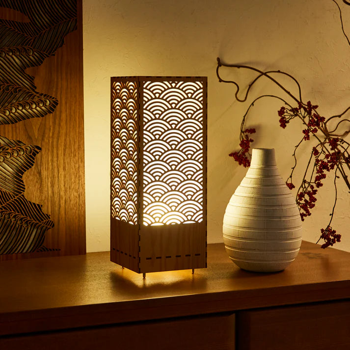 Our lamp features a simple design inspired by traditional Japanese patterns and the timeless art of kumiko woodwork. The delicate lattice pattern gently diffuses light, creating a calm and relaxing atmosphere in your space. Perfect for any interior—from living rooms to bedrooms—it adds an elegant touch to your everyday life.Please note: This lamp is inspired by traditional Japanese patterns and the concept of kumiko woodwork, but it is not an actual kumiko piece.