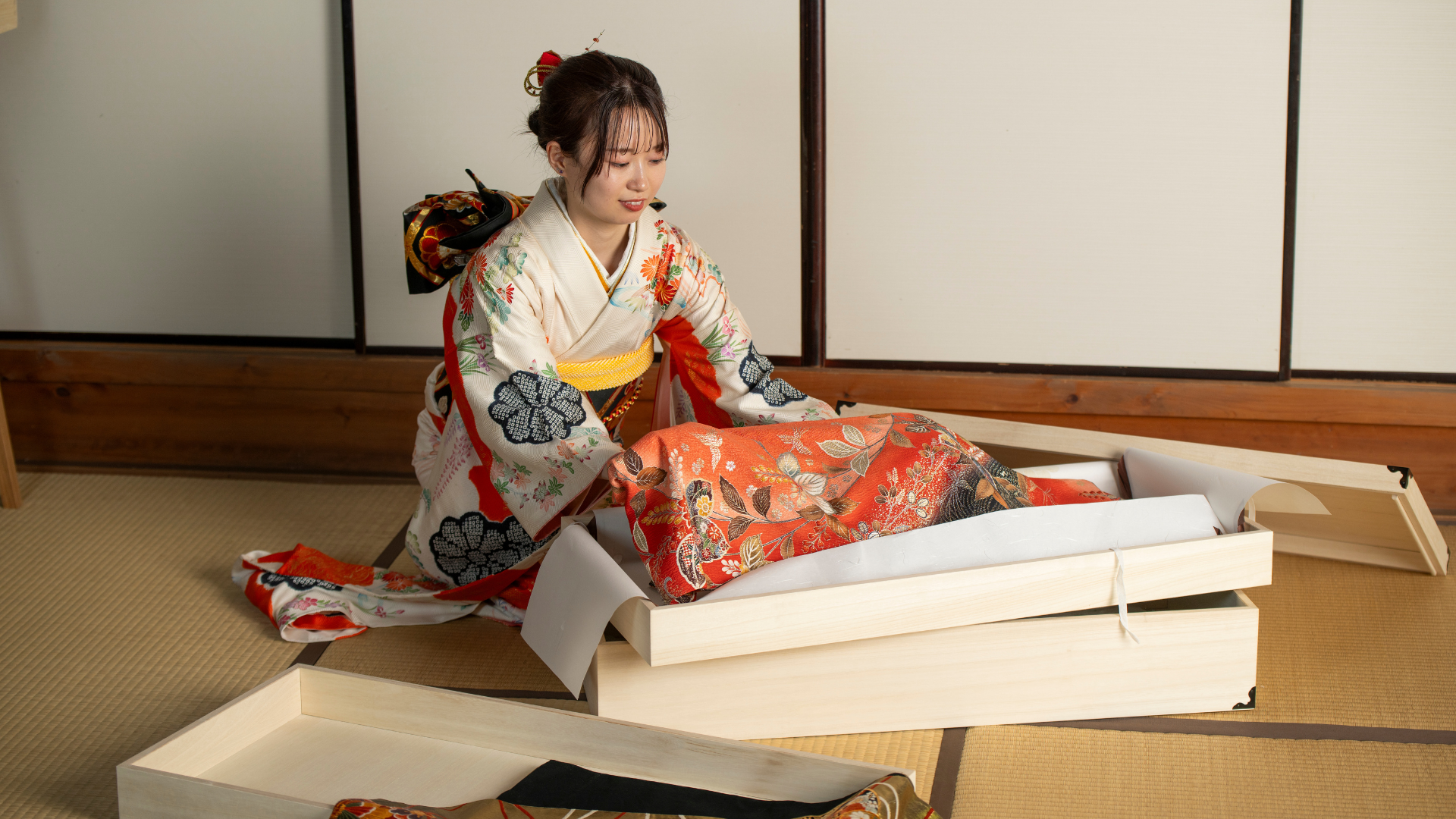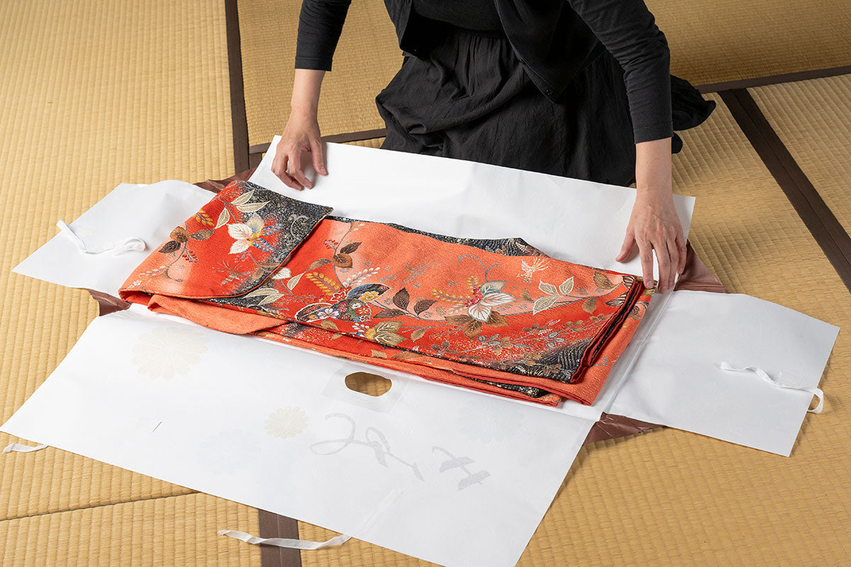 It is highly recommended that you wrap your kimono in tatoushi paper (traditional Japanese washi paper) before storing it in the drawer. This helps protect the fabric from dust, humidity, and discoloration.