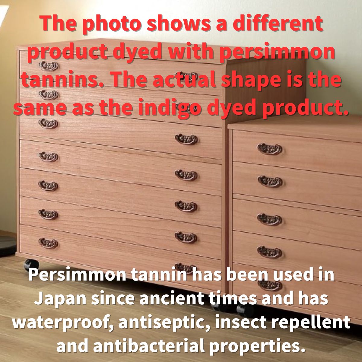 This elegant 6-drawer chest is crafted using solid Paulownia wood.and hand-dyed with traditional Japanese botanical dyes — indigo, shikon (gromwell root), and persimmon tannin.
