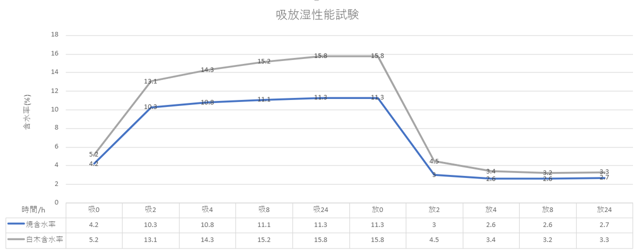 White paulownia wood grains and burnt paulownia wood grains were subjected to humidity control at room temperature of 40°C and 30% humidity for 17 hours, followed by moisture absorption at room temperature of 40°C and 90% humidity for 24 hours, and then continued to release moisture at 40°C. The moisture content during this process was measured.As shown in the graph, the moisture content was lowered and moisture absorption was successfully suppressed by applying burnt paulownia wood. The result is a light and comfortable sleeping surface that does not feel damp at any time.
