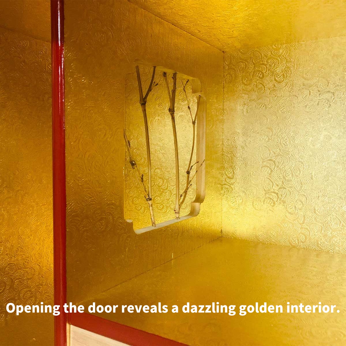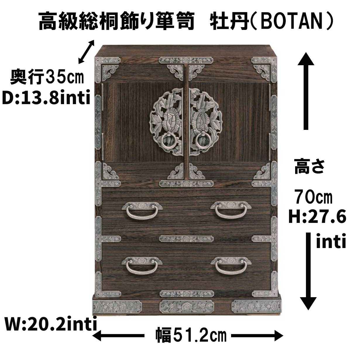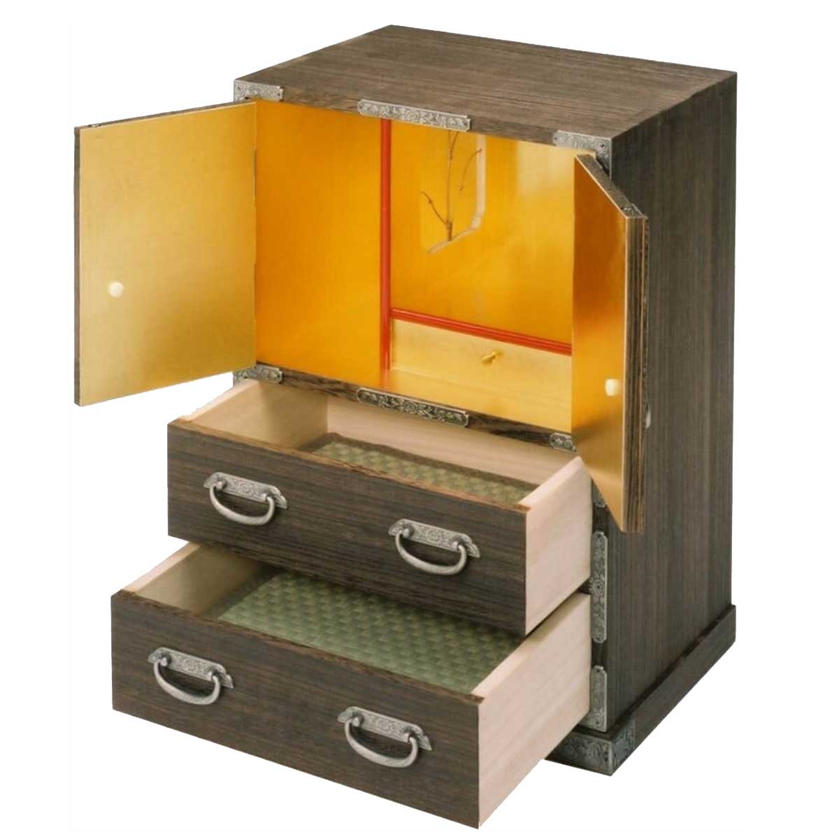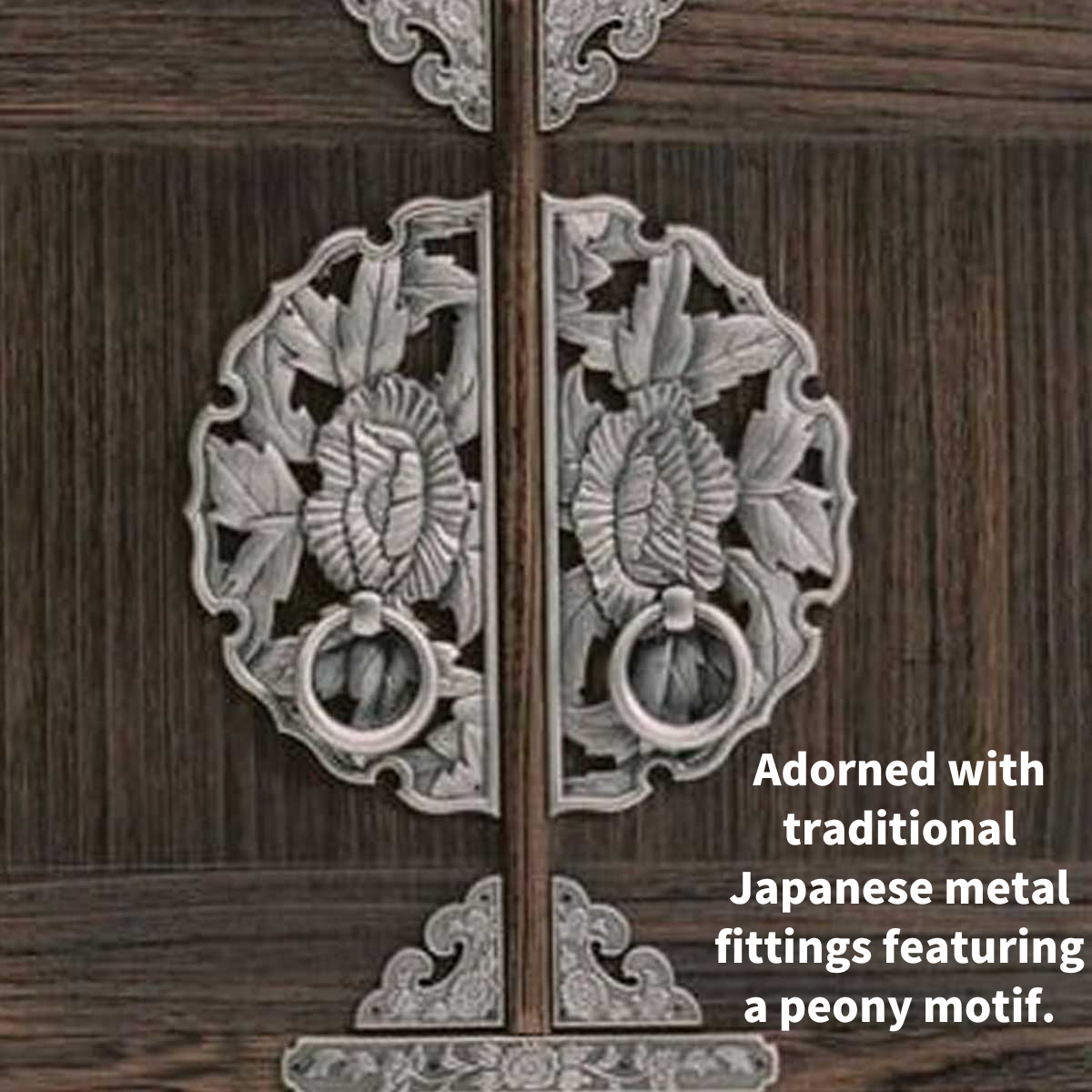 The chest is adorned with traditional Japanese metal fittings, featuring a sophisticated peony motif that embodies elegance and tranquility.