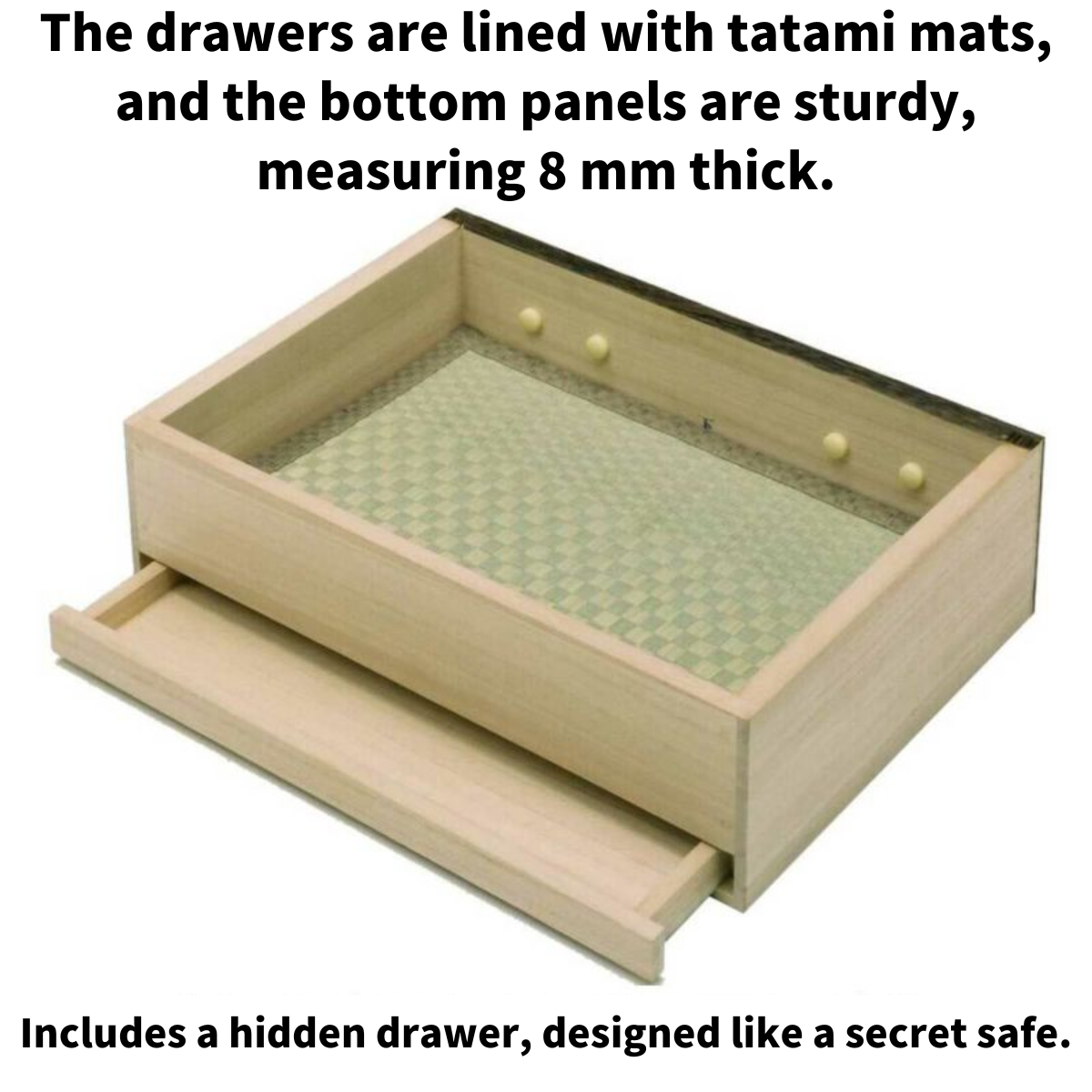 - The drawer interiors are lined with tatami mats for a touch of luxury.