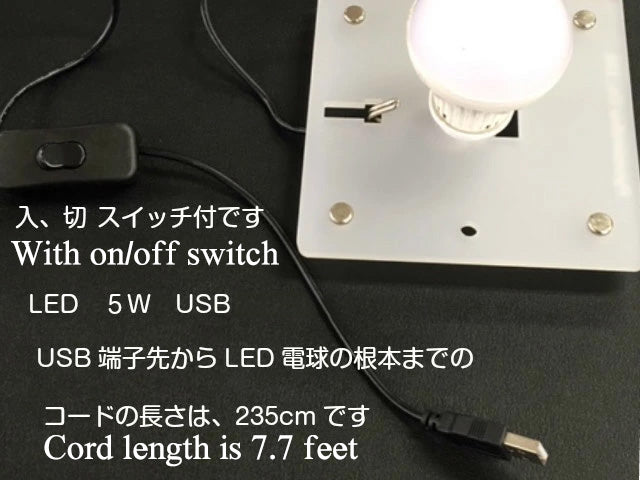 The power connection utilizes a USB terminal, with a cable length of approximately 92.5 inches (235 cm) from the terminal to the bulb.
