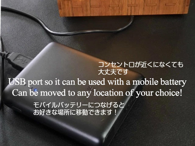 ・It can be connected to a mobile battery via a USB port, so it can be used anywhere.