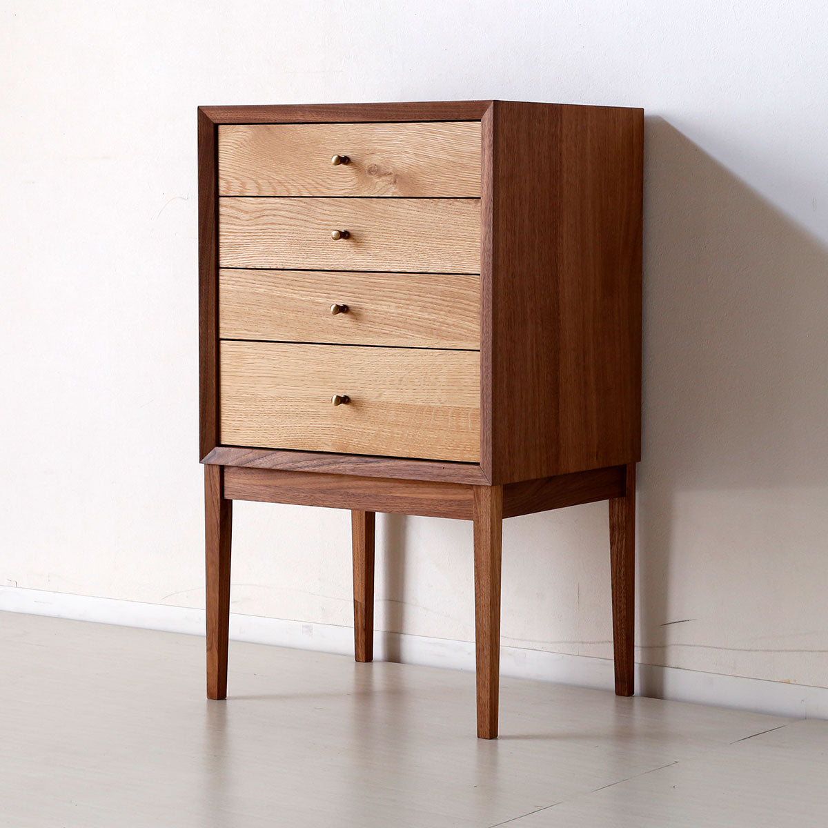 This modern Japanese chest combines beautiful two-tone colors of walnut and oak. The drawer fronts are made of solid oak, showcasing natural wood grain and knots, while the body features refined walnut veneer for a calm, luxurious look. Using Japan’s traditional “Shippo-shime” joinery, the 45° edges are seamlessly finished, concealing joints with precision. Compact yet elegant, this piece embodies Japanese craftsmanship and timeless design.