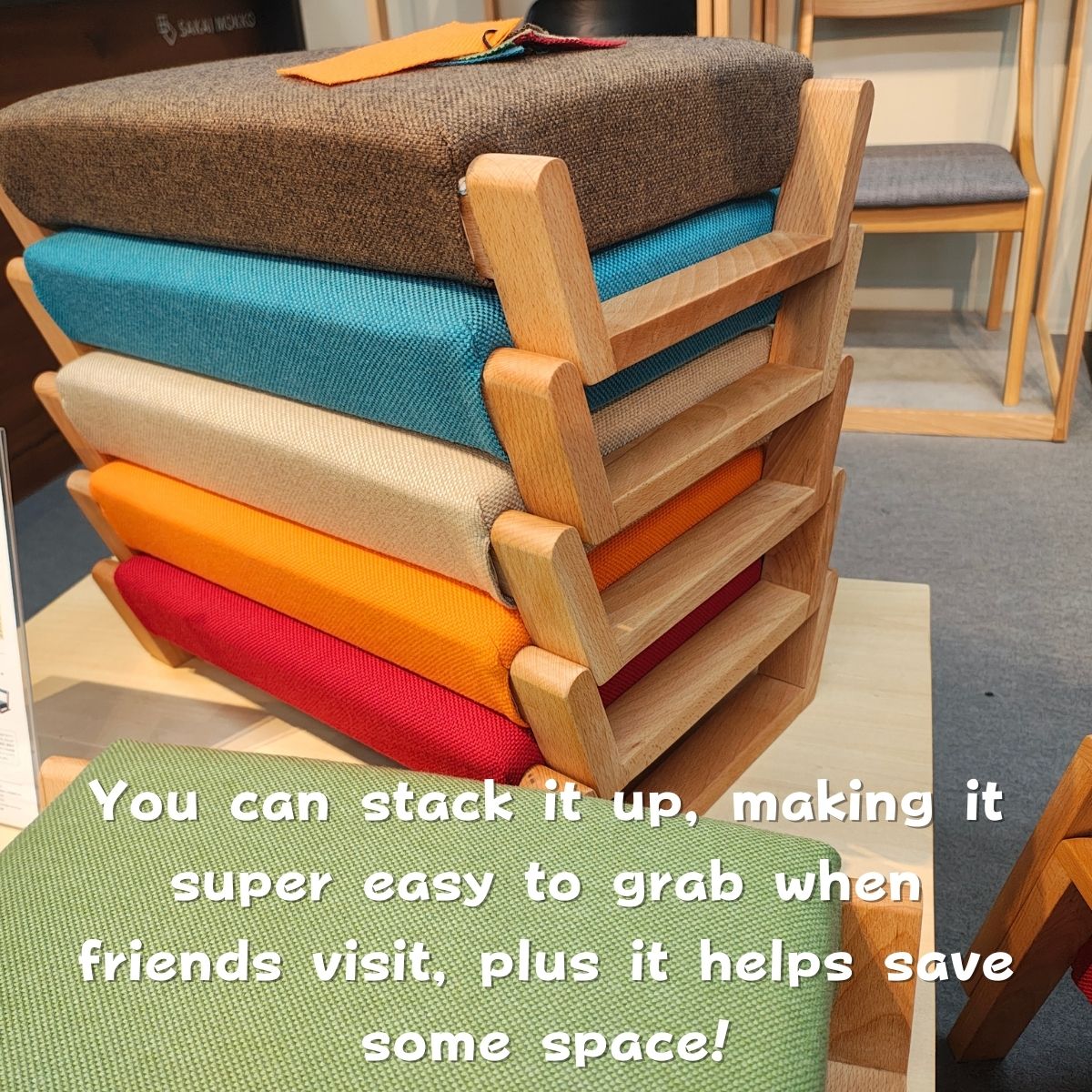 Backrest-free types (cross-legged and low-seat models) can be stacked neatly when not in use. Easily bring out just the right number of seats when guests arrive—practical and space-efficient.